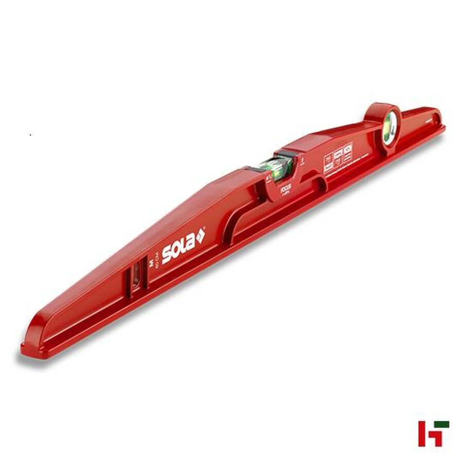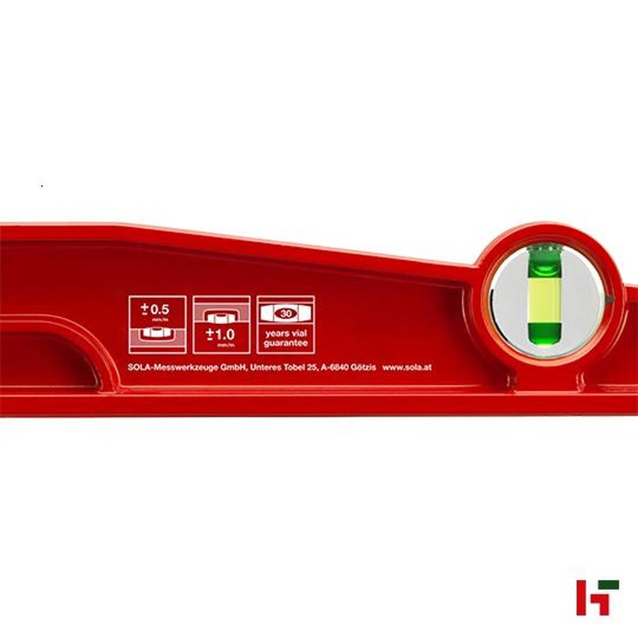 Beter, sneller en nauwkeuriger aflezen door gepatenteerde Sola focus libellen. De waterpas heeft onbreekbare acrylglazen bloklibellen met vergrotingslens (+20%) en een geoptimaliseerd lichtplaatje voor het beter aflezen. Hoge meetnauwkeurigheid in de normale positie en bij omslagmeting. Het is een zware, extreem robuuste waterpas van drukgietaluminium met gefreesd meetvlak voor zowel horizontaal als verticaal meten.