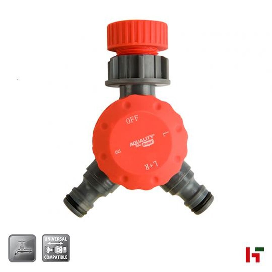 PVC kraanstuk met 2 uitgangen met draad van 1" naar 3/4". Waterverdeler met twee aparte uitgangen, geschikt voor het aansluiten van 2 klikaasluitingen. Regelknop om het debiet door de aparte uitgangen te regelen.