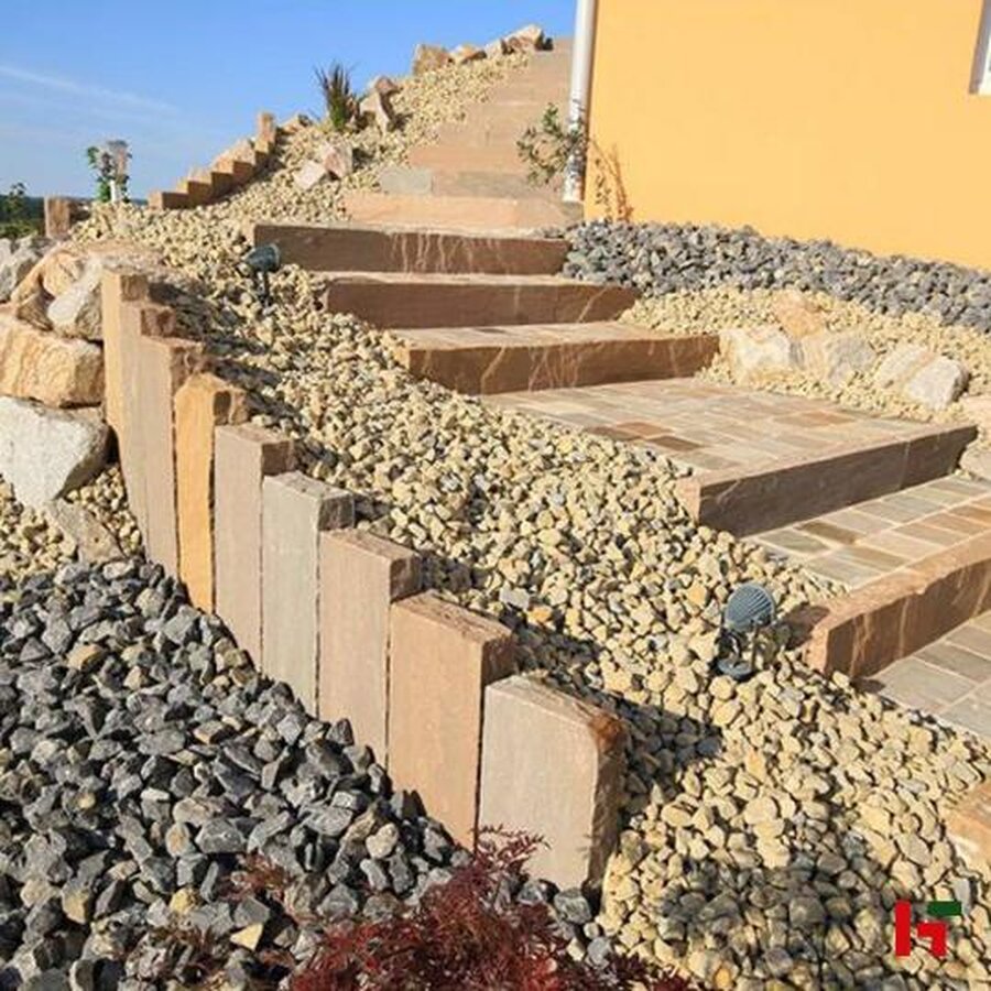 Het natuurruwe oppervlak en de kegelvormige gekloven kanten zijn kenmerkend voor deze buitengewoon harde en duurzame zandsteen uit Indië. Leg je tuin aan in Kandla Grey of Kandla Mix, elk een schitterende mengeling van oker, grijze, bruine en rode nuances. Deze zandsteen bevat ijzer waardoor er roestplekken kunnen optreden.
