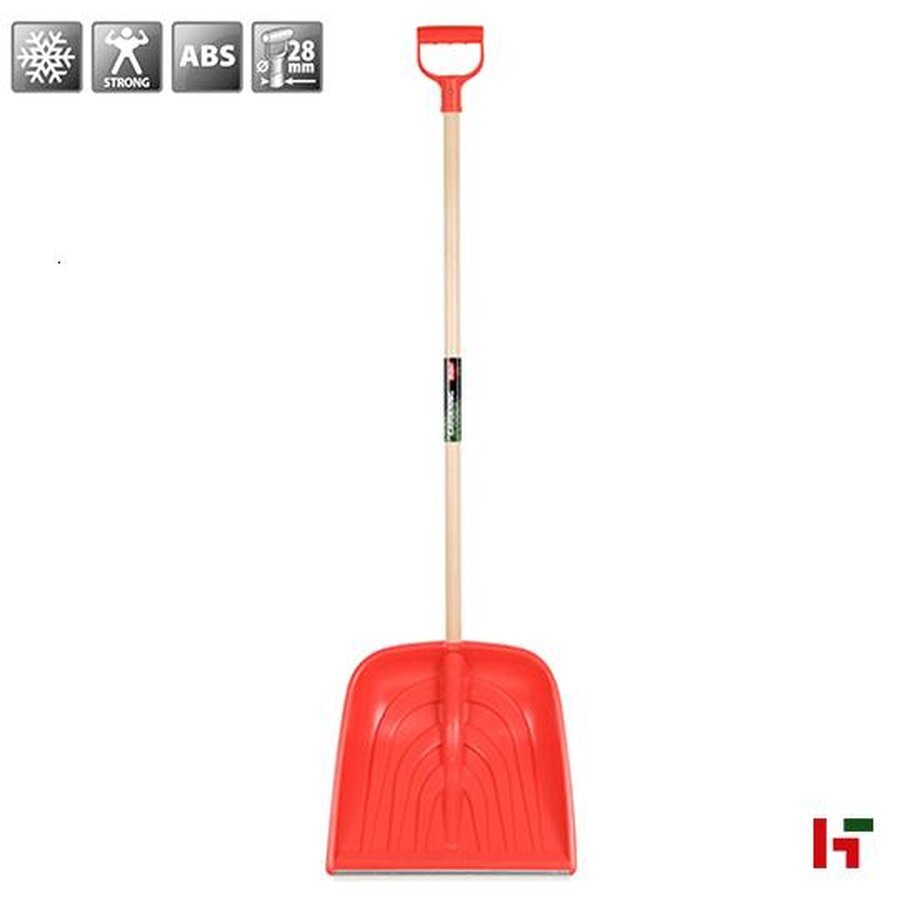 Sneeuwschop uit rode ABS plastic met essen steel voor het ruimen van sneeuw. De scheprand is voorzien van een roestvrijstalen strip.